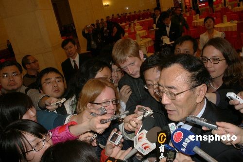 3月5日,十一屆全國(guó)人大二次會(huì)議開幕會(huì)在北京人民大會(huì)堂隆重舉行。圖為中外記者爭(zhēng)相采訪西藏自治區(qū)主席向巴平措。中新社發(fā) 金立冬 攝