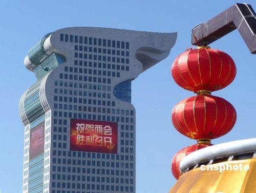 2009年3月5日上午,十一屆全國人大二次會議在北京人民大會堂隆重開幕。北京奧林匹克公園旁的“盤古大觀”上的大屏幕打出“祝賀兩會勝利召開的”字幕,為全國兩會的召開增添喜慶氣氛。中新社發 玉龍 攝