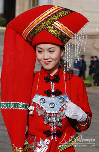3月5日上午,是十一屆全國人大二次會(huì)議在人民大會(huì)堂內(nèi)開幕的時(shí)間,會(huì)場(chǎng)內(nèi)代表委員們?yōu)闇乜偫砭实恼ぷ鲌?bào)告鼓掌喝彩,會(huì)場(chǎng)外人民大會(huì)堂東側(cè)門口的廣場(chǎng)上也因這些姑娘們的出現(xiàn)而光彩靚麗。她們是此次大會(huì)的壯族禮儀姑娘們,她們有著與60年共和國的旗幟一樣的色彩——中國紅!