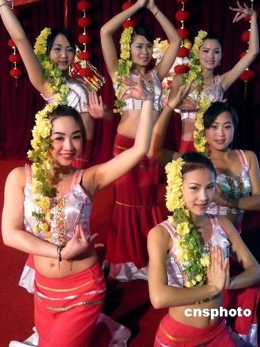 3月7日,為慶祝“三.八”國際婦女節的到來,北京植物園舉行賞花送花活動。特設的“女人花”展區內展示的花卉名稱中均帶有“女”字:如“小葉女貞”、“舞女蘭”、“美女櫻”等。每位在熱帶展覽溫室參觀的女士,可以得到一束美麗的康乃馨。圖為云南傣族姑娘頭戴鮮花為參加活動的游客表演舞蹈。中新社發 錢興強 攝