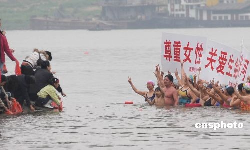 圖:南寧冬泳愛好者游邕江慶祝三八節