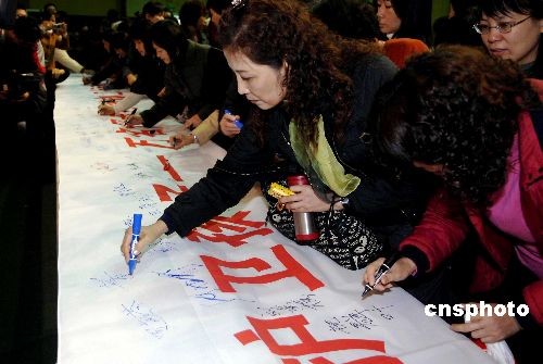 三月八日國際婦女節,由廣東省婦聯主辦的“凈化網絡護衛孩子--萬名母親網絡護衛行動”啟動儀式,在廣州華南師范大學附屬中學舉行。圖為母親和孩子紛紛簽名支持該項活動。中新社發 劉衛勇 攝