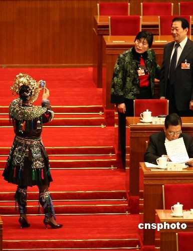 3月9日,十一屆全國人大二次會議在人民大會堂舉行第二次全體會議,身穿少數民族服飾的女代表會前在主席臺上為參會代表拍紀念照。中新社發(fā) 杜洋 攝