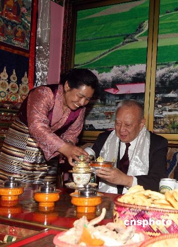 3月11日,參加“兩會”的全國政協副主席董建華,前往北京民族文化宮參觀“西藏民主改革50年展覽”。圖為董建華在參觀時感受藏族民俗。中新社發 張宇 攝