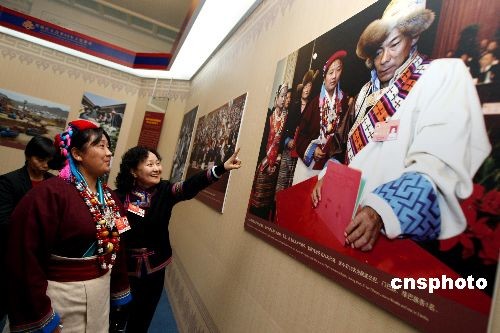 3月11日,全國政協民族界委員參觀在北京民族宮舉辦的西藏民主改革50年大型展覽,西藏自治區錯那縣民政局副局長美朵曲珍在展廳里看到了自己的照片。中新社發 傅丹丹 攝