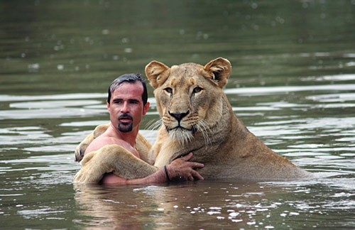 凱文·理查德森與自己的好友——重達185公斤的母獅一起戲水。