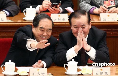 3月13日,十一屆全國人大第二次會議在人民大會堂舉行閉幕會,全國人大財(cái)政經(jīng)濟(jì)委員會主任委員石秀詩、貴州省委書記石宗源在主席臺上和主席臺下的代表打招呼。中新社發(fā) 杜洋 攝