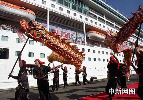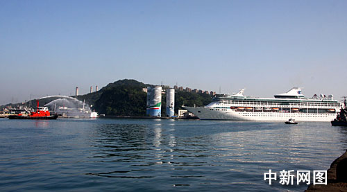 三月十六日上午八時二十分許,“安利心印寶島萬人行”首航郵輪“海洋神話號”載著一千六百名安利中國大陸首發人員緩緩駛進臺灣基隆港。這是兩岸基本實現“三通”以來第一個抵臺的郵輪直航團。中新社記者 陳立宇 攝
