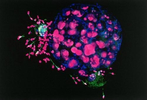 人類胚胎和精子:這張色彩艷麗的美麗圖片,是利用共聚焦顯微鏡拍攝的。胚胎和精細胞核呈紫色,而精子的尾巴是綠色。藍色區域是縫隙連接(gap junction),它們把細胞彼此聯系在一起。