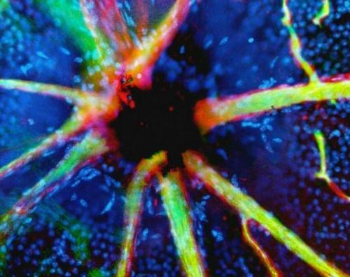 從視神經(jīng)中伸出的血管:這張照片顯示的是血管從黑色視盤中伸出。視盤是個(gè)盲點(diǎn),因?yàn)橐暰W(wǎng)膜的這個(gè)區(qū)域沒(méi)有光感細(xì)胞,視神經(jīng)和視網(wǎng)膜血管從眼睛后面的這個(gè)部位伸出去。