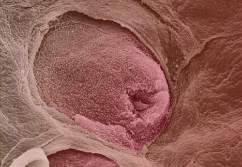 舌頭上的味蕾:這張彩色圖片上顯示的是舌頭上的一個(gè)味蕾。人舌上大約擁有10000個(gè)味蕾,味蕾所感受的味覺(jué)可分為甜、酸、苦、咸四種。