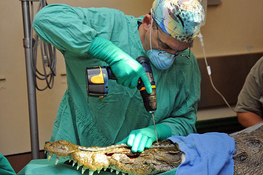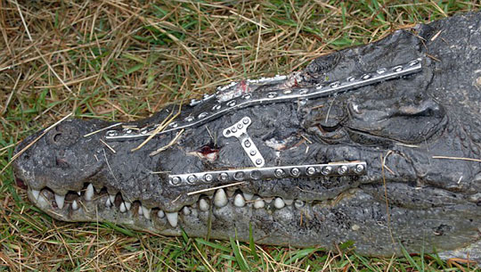 據(jù)英國媒體3月18日報道,美國佛羅里達(dá)動物園一只受傷的大鱷魚,經(jīng)過手術(shù),頭部被41枚釘子以及4塊鐵板固定,現(xiàn)在被人戲稱為“機(jī)器鱷魚”。這只長達(dá)10英尺的鱷魚是在一起車禍?zhǔn)鹿手惺軅摹=?jīng)醫(yī)生介紹,現(xiàn)在鱷魚的恢復(fù)情況良好。