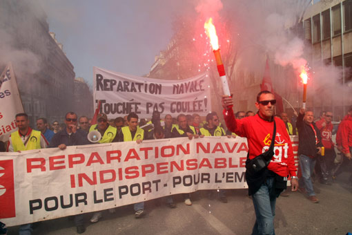 3月19日法國各大工會在全國各地聯合組織罷工和示威游行等活動,抗議薩科齊政府在應對當前經濟危機過程中忽視勞動者權益和社會福利。圖為法國城市馬賽舉行罷工游行。
