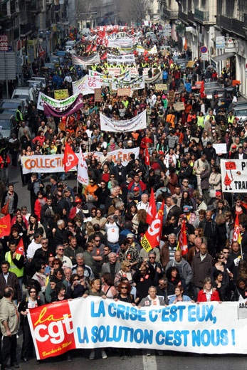 3月19日法國各大工會在全國各地聯合組織罷工和示威游行等活動,抗議政府在應對當前經濟危機過程中忽視勞動者權益和社會福利。