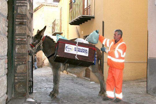 意大利一環(huán)衛(wèi)工帶著驢收垃圾 省錢又環(huán)保。在意大利的卡斯特爾博諾,一名環(huán)衛(wèi)工人帶著驢一起收垃圾。這座西西里島南部的小鎮(zhèn)近日用驢子取代卡車來運(yùn)輸居民的垃圾。鎮(zhèn)長馬里奧·西塞羅表示,驢子比卡車更環(huán)保,而且費(fèi)用也更便宜。