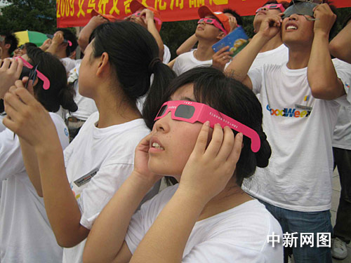 記者在觀測現場看到,一些天文愛好者早已架起了專業的望遠鏡;而許多市民則走起“平民路線”,戴起墨色眼鏡或黑色遮光玻璃片擋住太陽光,以便更清晰地看清日食;更有“經驗老道”的市民,在臉盆里倒上墨汁,觀看太陽的倒影,平添了幾分傳統神秘色彩,引來了無數的圍觀者。