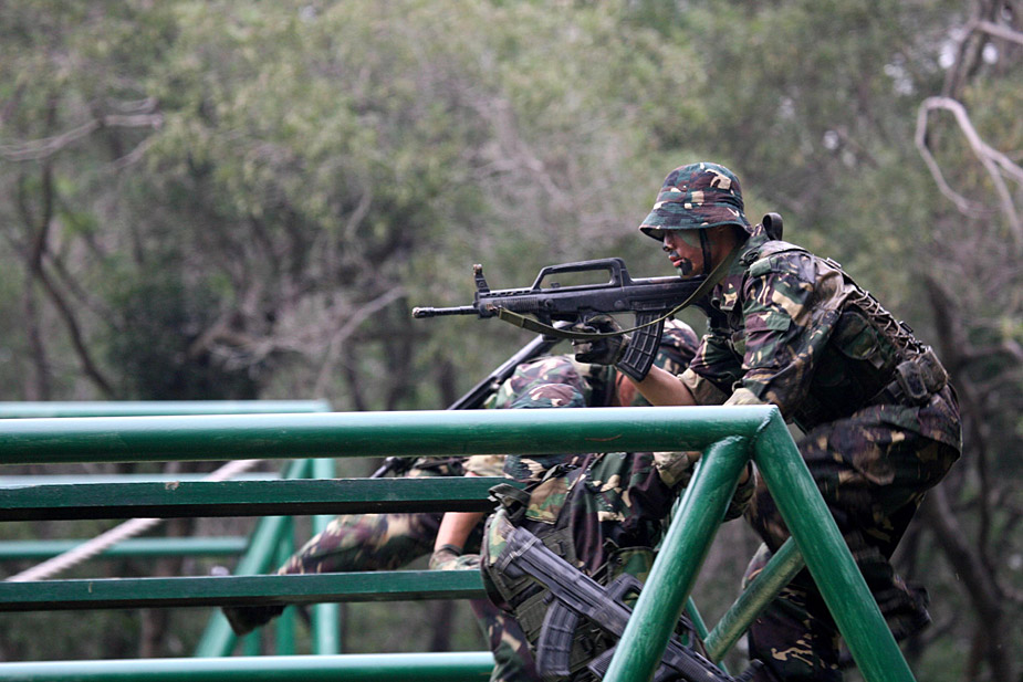 本網記者近日在中國人民解放軍駐香港部隊石崗營區訓練場,觀看了駐港部隊偵察兵實彈突擊演練。身穿迷彩服、面涂油彩的戰士們冒著“槍林彈雨”,背負槍械攻克障礙,其間穿越火障、跨越滑橋、潛灘暗渡,更肩扛一百公斤的圓木進行二百米極限沖刺。這些障礙項目是對戰士意志、體力與心理的多重磨練,連續通過二十一個項目,更是挑戰體能的極限。鄭祚聲 攝