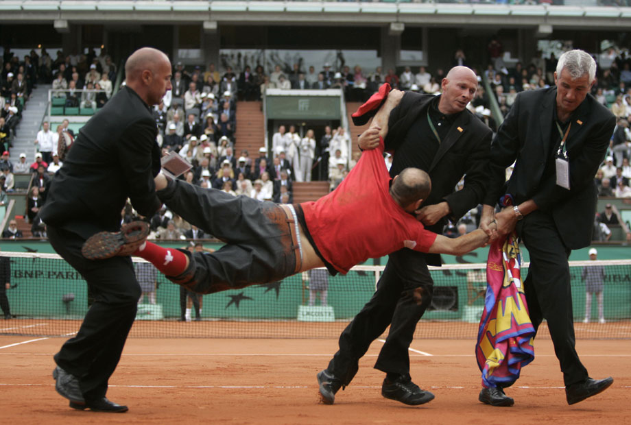 法網男單決賽場上,一位費天王的癡心球迷沖入球場,強行將自制的一頂帽子戴到費德勒的頭上。安保人員及時出現,將狂熱粉絲架出場外。