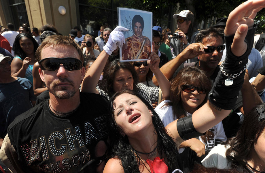 數百名沒有入場券的歌迷聚集在附近的警戒線外高呼邁克爾的名字,共同悼念一代“流行天王”。 中新社發 張煒 攝