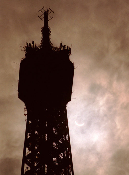 圖為1999年8月1日在法國埃菲爾鐵塔旁觀測到得日全食景觀的發生過程。