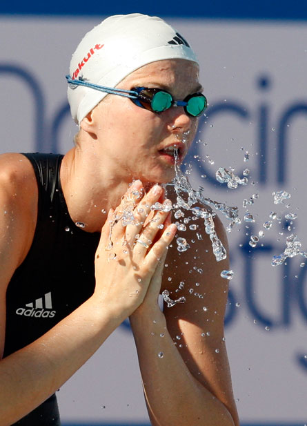 “口吐蓮花”——7月30日,德國選手布麗塔·斯特芬完成女子100米自由泳預賽后表演“口吐蓮花”。