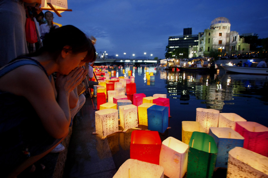 8月6日,日本民眾在廣島原子彈爆炸遺址前燃放河燈,紀念原子彈爆炸64周年的遇難者。
