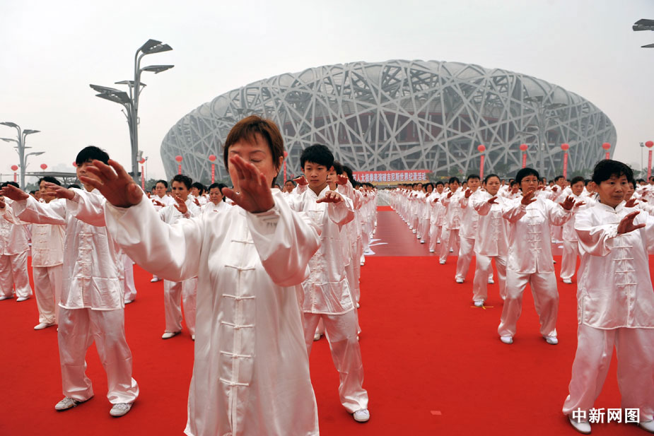 8月8日,全國首個“全民健身日”北京主會場啟動儀式上,三萬多群眾進行太極拳展示活動,在世界吉尼斯總部認證官員的見證下成功打破世界紀錄。中新網記者 金碩 攝