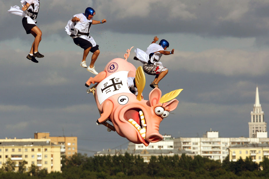 8月9日,莫斯科河畔舉辦一年一度的“墜落節”,表演者帶著自己設計制作的各種“飛行器”勇敢的從高空跳入水中。