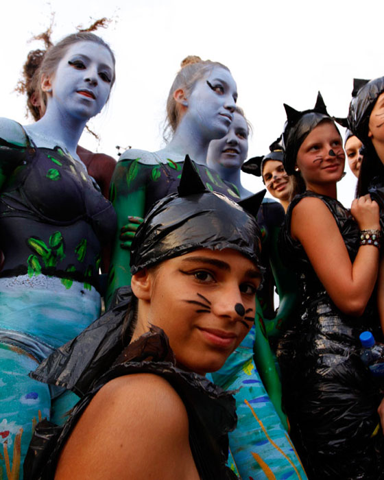 圖為參加狂歡節(jié)的人們?cè)谀樕线M(jìn)行“涂鴉”。