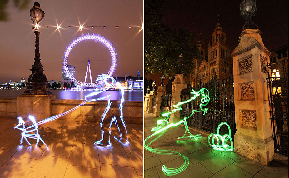 攝影師Michael Bosanko在英國(guó)倫敦拍攝的名為“溜狗的人”(左)和“恐龍”的光涂鴉照片。
