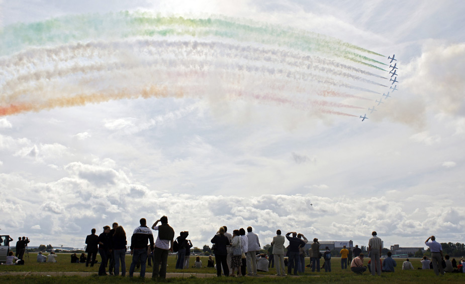 圖為觀眾在觀看意大利空軍“三色箭”飛行隊精彩的特技飛行表演。