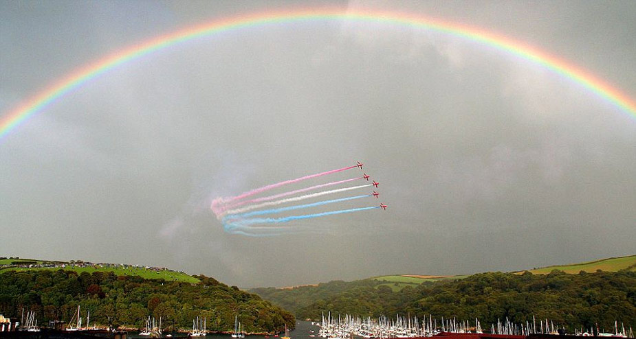 據(jù)英國(guó)媒體近日?qǐng)?bào)道,英國(guó)皇家空軍“紅箭”飛行表演隊(duì)20日在英國(guó)康沃爾郡福伊港進(jìn)行飛行特技表演時(shí),恰巧天邊出現(xiàn)一道彩虹,相映成輝,異常漂亮。