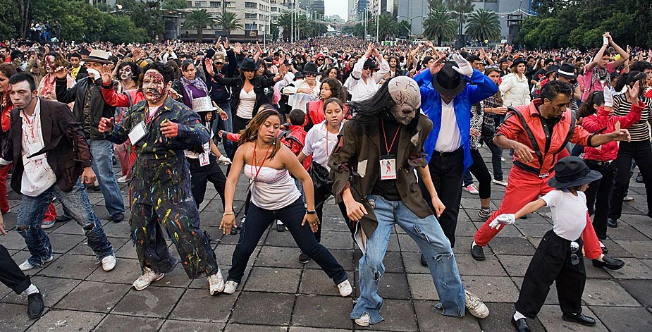 8月29日,逾萬名墨西哥人在墨西哥城廣場同時跳舞,用以紀念邁克爾·杰克遜第51個“生日”,同時也試圖打破同時跳舞人數最的吉尼斯世界紀錄。圖片來源:中國新聞網