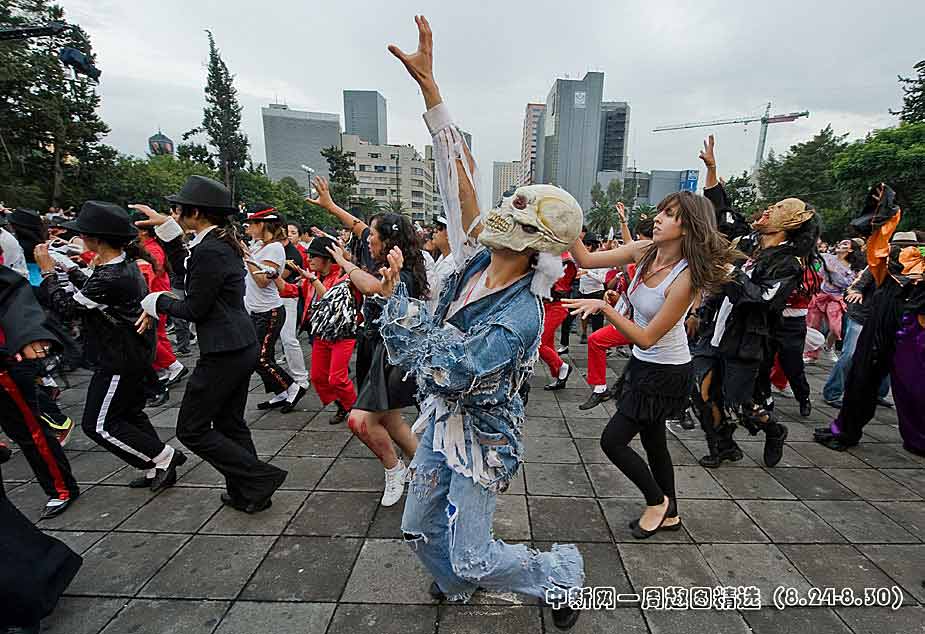 逾萬名墨西哥人在墨西哥城廣場同時跳舞,用以紀念邁克爾·杰克遜第51個“生日”,同時也試圖打破同時跳舞人數最的吉尼斯世界紀錄。圖片來源:中國新聞網