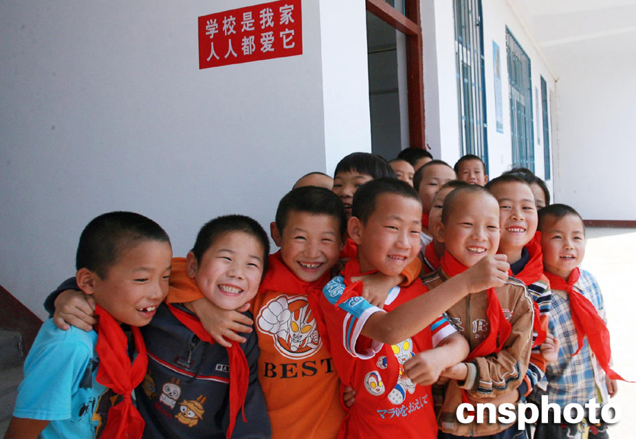 8月31日上午,河南許昌市姬營村,南水北調移民姬營小學的小學生聚集在新落成的教室門口笑逐顏開。當日是姬營小學落成開學的第一天,該小學占地5.8畝,擁有740平方米的教學樓、270平方米的教師辦公室,現有移民新生158人,其中,學前班47人,一至六年級111人。中新社發 王中舉 攝