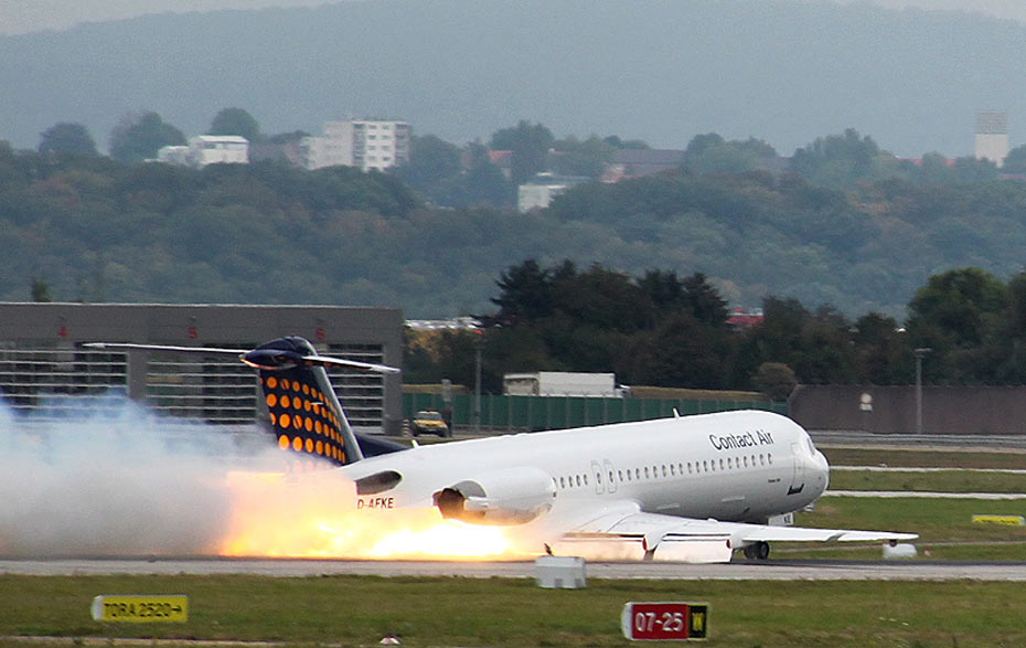 9月14日,在德國南部的斯圖加特機場,一架?100客機由于技術故障原因緊急迫降在停機坪跑道上,未造成人員傷亡。圖片來源:中國新聞網