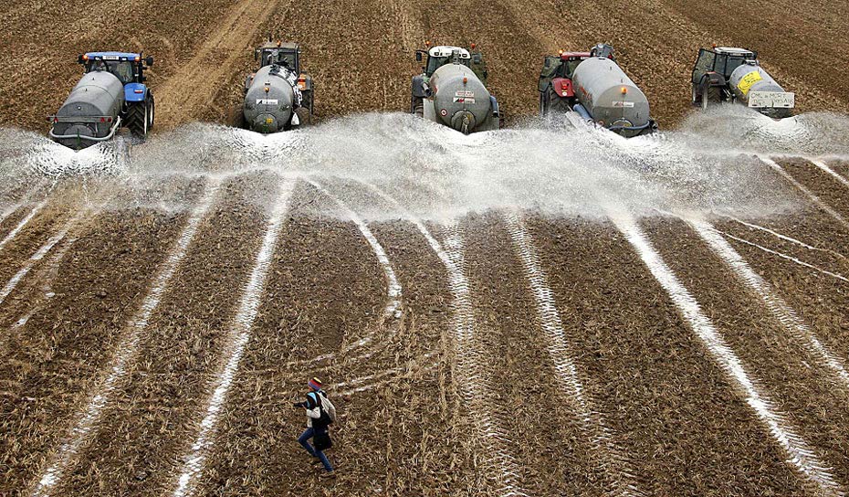 9月16日,比利時奶農(nóng)向地里傾倒了3百萬升鮮牛奶做“農(nóng)肥”,抗議奶價暴跌。奶農(nóng)們認(rèn)為,提高牛奶生產(chǎn)配額造成歐盟市場上奶制品供大于求,進(jìn)而引發(fā)價格暴跌。圖片來源:中國新聞網(wǎng)
