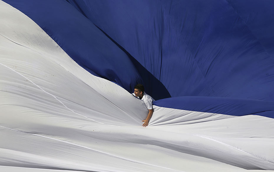9月17日,在耶路撒冷的一個體育場內(nèi),一名以色列男孩在一幅巨大的、鋪展開的旗子上玩耍。它被吉尼斯世界紀(jì)錄評為世界上最大的旗子。圖片來源:中國新聞網(wǎng)