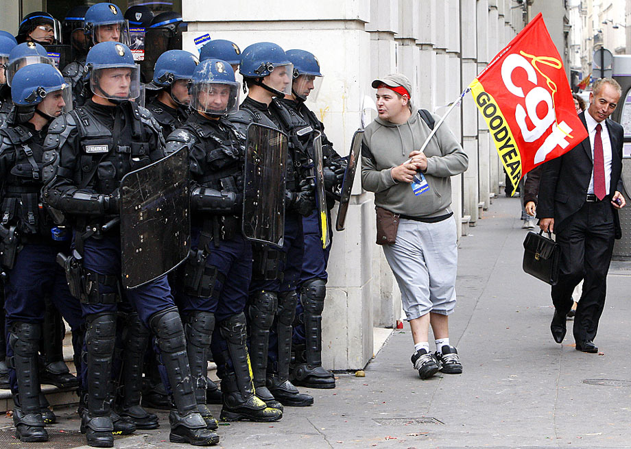 9月17日,在巴黎的金融市場管理局總部前,一名固特異公司雇員與保衛總部大樓的防暴警察面對面。當天,數百人舉行抗議反對汽車制造業裁員和重組。圖片來源:中國新聞網