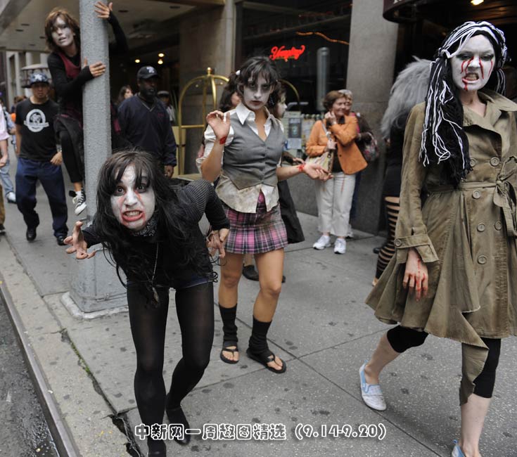 當地時間9月16日,在美國紐約時代廣場,一群演員裝扮成僵尸的樣子,在街頭行走,提前為下個月到來的萬圣節造勢。圖片來源:中國新聞網