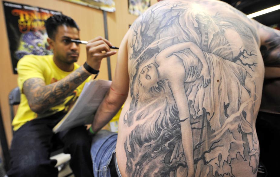 法國巴黎9月20日舉行“紋身藝術節”,吸引了成百上千紋身藝術大師到場獻藝。圖片來源:中國新聞網