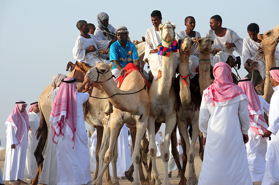 9月25日,在沙特阿拉伯東部的哈利斯,駱駝騎士們騎著自己的座駕在大漠中飛馳。圖片來源:中國新聞網(wǎng)