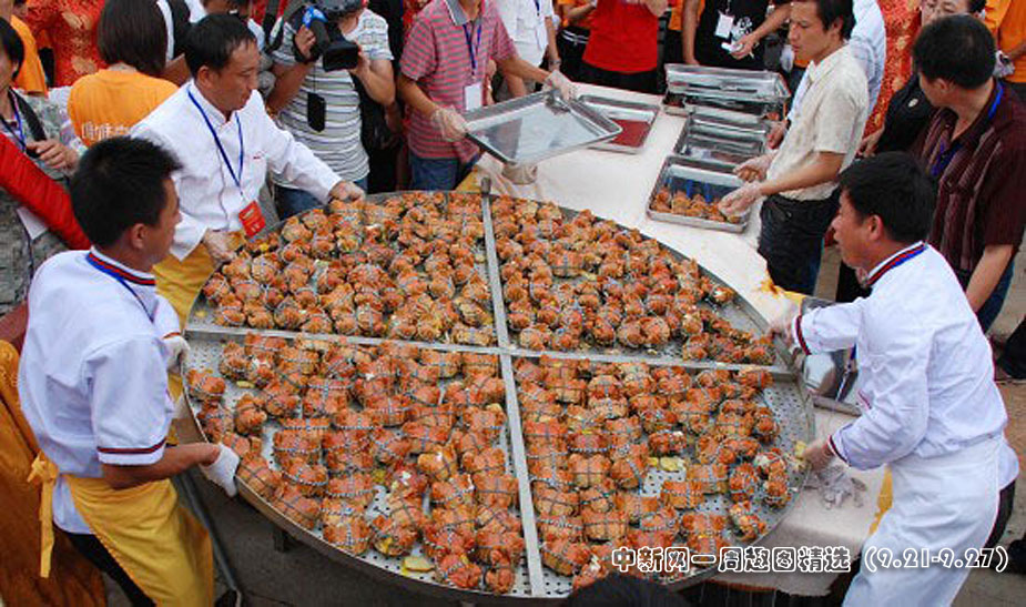 9月26日,蘇州唯亭鎮陽澄湖大閘蟹開捕節上一口直徑2米的大鍋一次蒸出2009只大閘蟹,并邀請蘇滬杭三地市民到場共同品蟹。圖片來源:中國新聞網