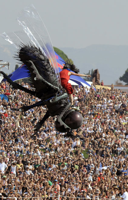 9月27日,法國馬賽趣味飛行器大賽舉行。比賽規則簡單,誰能在落水之前飛得更遠誰就是冠軍,但參賽選手絞盡腦汁,把自己的飛行器扮成各種古怪摸樣。圖片來源:中國新聞網