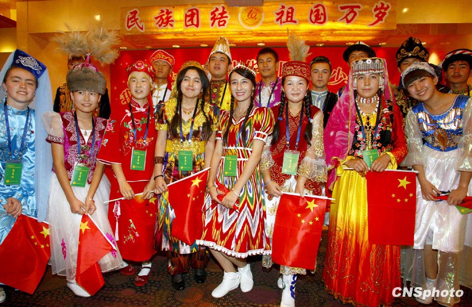 9月24日晚,“我愛我的祖國——中華各民族青少年同心營”在北京開營。本次同心營活動從全國56個民族中挑選男女各一名優秀學生代表共計112人進京參加,在北京期間,營員們不僅將與北京少先隊員一起繡國旗,國慶當天,他們將穿上本民族的服飾,組成“國旗禮儀隊”,簇擁在天安門廣場國旗旗桿下,代表56個民族的青少年共迎國旗。中新社發 鄭雄增 攝