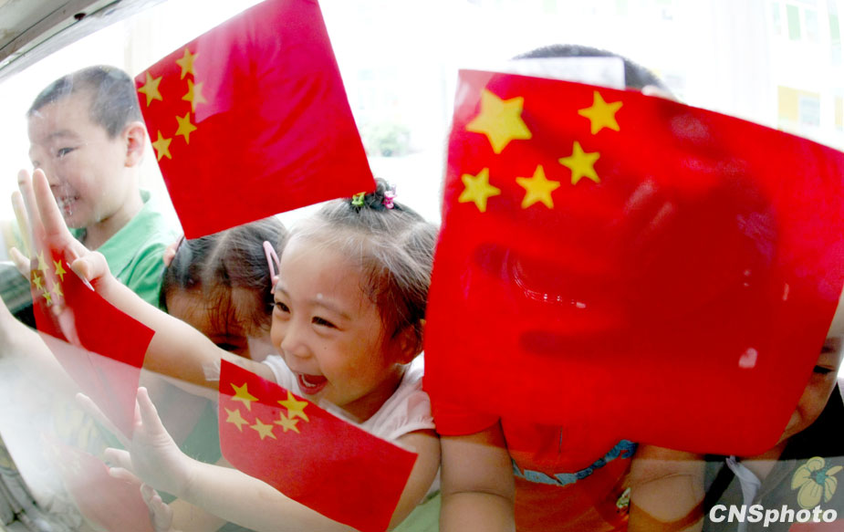 9月17日,在江蘇省無錫市僑誼實驗幼兒園,孩子們正在教室里貼自己親手制作的五星紅旗。為迎接國慶節的到來,該校開展了一系列的紅色教育,親自動手做一面五星紅旗更是成了第一課。 中新社發 張浩 攝