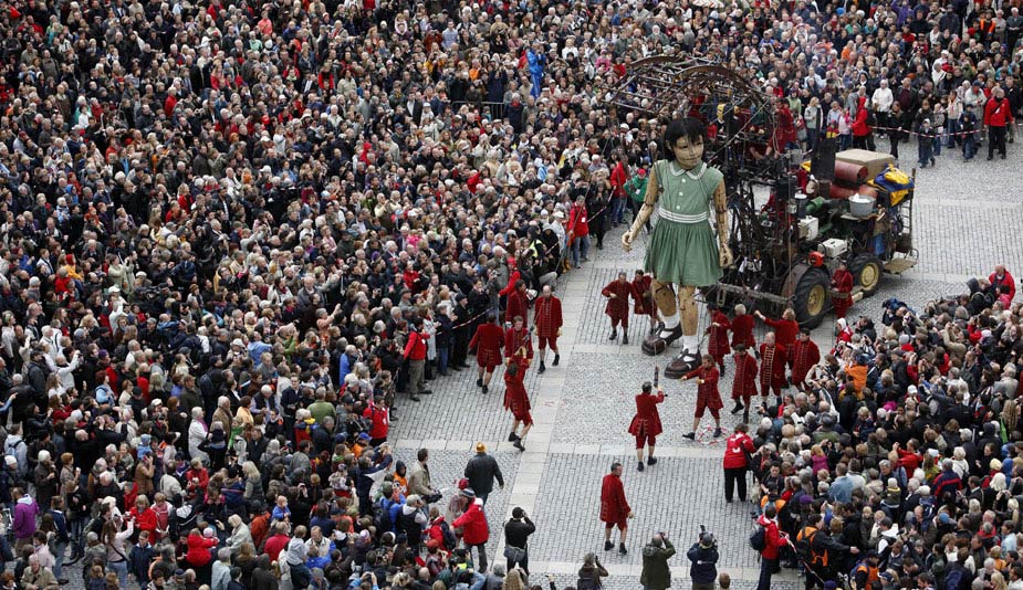 10月2日,來自法國一家戲劇公司的兩個巨型提線木偶亮相柏林街頭,它們將在露天劇場進(jìn)行表演,以此紀(jì)念柏林墻推倒20周年。圖片來源:中國新聞網(wǎng)