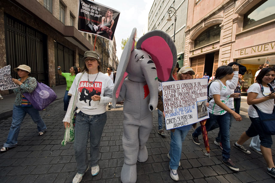 10月4日,在墨西哥首都墨西哥城,參加世界動物日活動的人們頭帶面具,手舉圖片,呼吁人們關注動物權益。