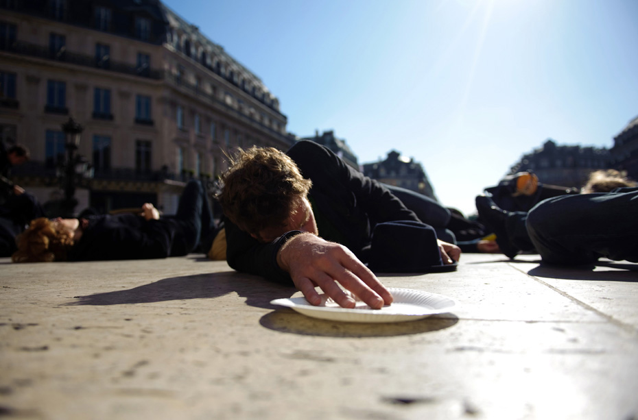 10月15日,示威者身穿黑色衣服、手持空盤子在巴黎歌劇院前抗議。他們此舉是為了呼吁人們關(guān)注世界上的饑民。圖片來源:中國新聞網(wǎng)