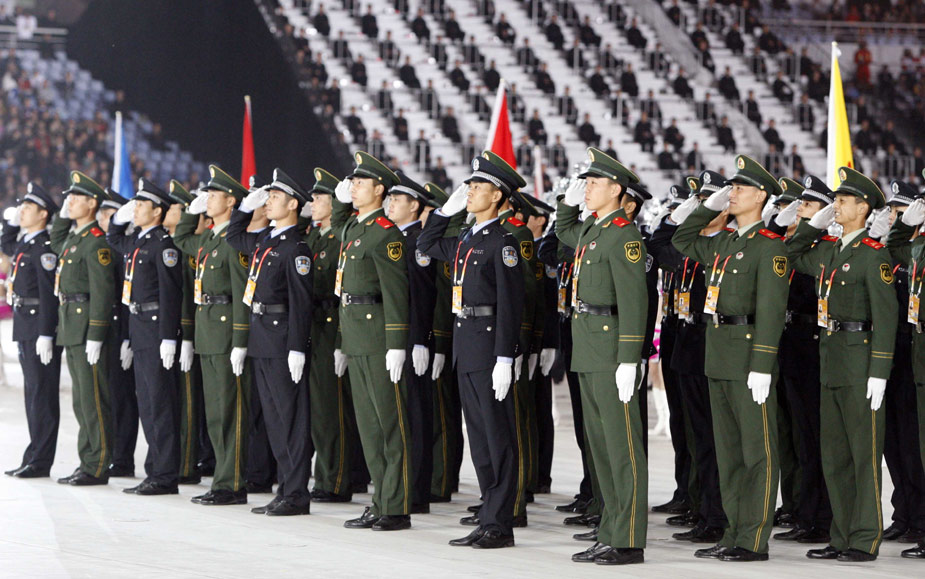 十月十六日晚,中華人民共和國第十一屆運動會在山東濟南奧體中心隆重開幕。由武警和公安組成的前衛體協代表團入場時面向主席臺敬禮。中新社發 張宇 攝